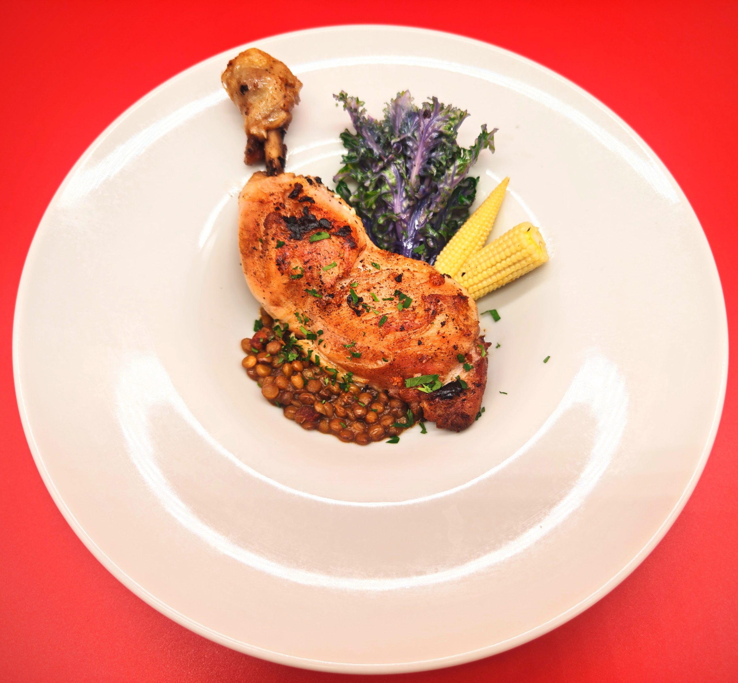 ★Carne 本日のお肉料理 骨付き鶏腿肉のコンフィタード ~チョリソとレンズ豆の煮込みを添えて~