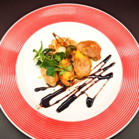 鶏もも肉のアドボ ガルバンソのピューレ添え